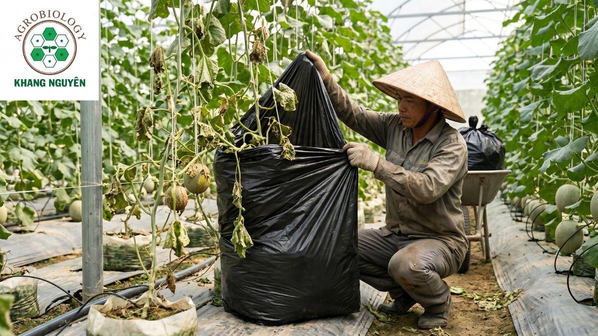 - Bước 1 – Tiêu hủy “Chuẩn y tế”: Trùm bao nilon kín toàn bộ cây bệnh (từ ngọn xuống tận bầu giá thể PE), nhổ bật rễ mang ra xa khỏi khu vực nhà màng để đốt hoặc chôn lấp sâu. Rắc vôi bột vào vị trí vừa nhổ.