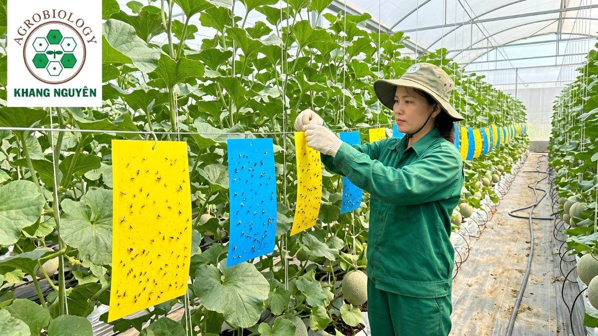 Sử dụng bẫy dính màu xanh dương và màu vàng để kiểm soát mật độ bọ trĩ hại dưa lưới trong nhà màng