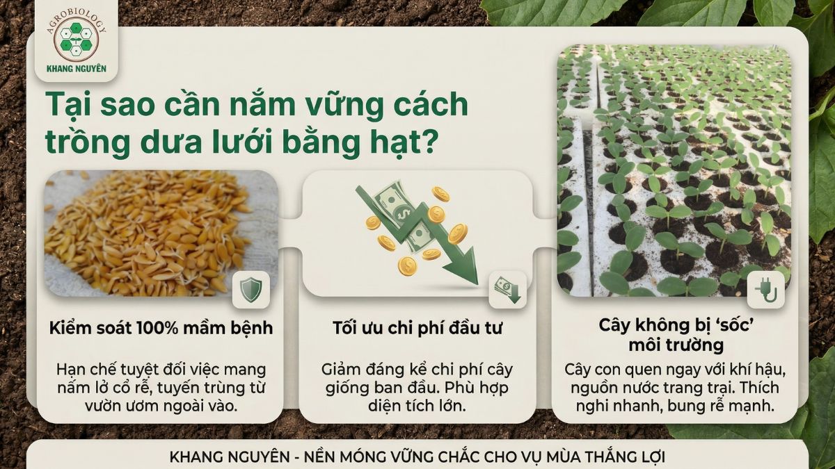 Nhiều trang trại thường chọn mua cây giống ươm sẵn để tiết kiệm thời gian. Tuy nhiên, việc tự chủ áp dụng cách trồng dưa lưới bằng hạt ngay tại farm mang lại những giá trị sinh lời bền vững hơn rất nhiều: