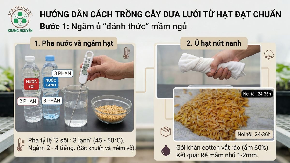 Để đảm bảo an toàn tuyệt đối cho mẻ giống F1 đắt tiền và hiểu rõ cơ chế sinh lý của hạt, Anh/Chị nên tham khảo bài viết chuyên sâu về cách ngâm hạt dưa lưới chuẩn khoa học từ Khang Nguyên. Về cơ bản, thao tác này sẽ bao gồm các thông số cốt lõi sau: