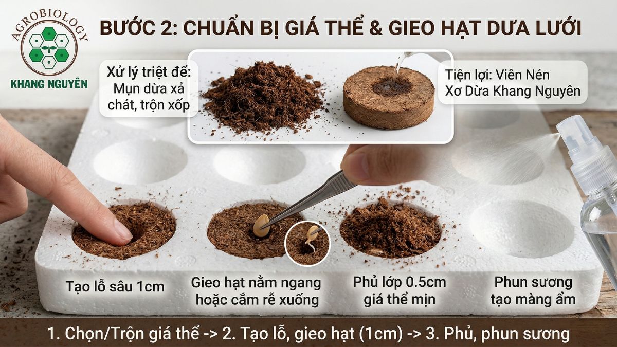 - Bước 2 (Gieo hạt): Thực hiện cách gieo hạt dưa lưới vào khay ươm hoặc Viên nén xơ dừa. Bắt buộc dùng giá thể đã xả sạch chát. Đặt hạt nằm ngang hoặc hướng rễ xuống, sâu 1cm.