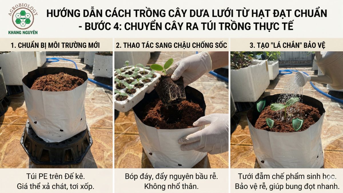 - Chuẩn bị môi trường mới: Sử dụng Túi trồng dưa lưới PE đặt trên Đế kê chậu (giúp thoát nước tuyệt đối, ngăn rễ chạm đất nhiễm nấm). Giá thể trong túi PE cũng phải được xả chát và ủ vi sinh tơi xốp.