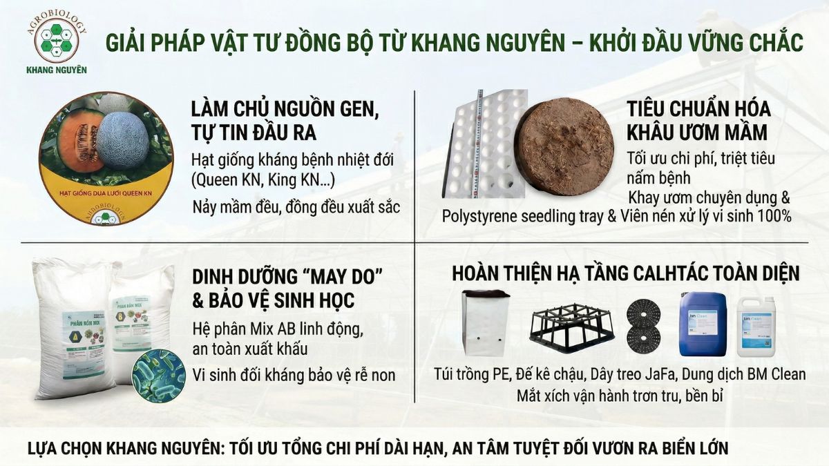 - Hoàn thiện hạ tầng canh tác toàn diện: Không dừng lại ở cây giống, Khang Nguyên tiếp tục “cắm chốt” đồng hành cùng chuỗi vật tư hạ tầng đồng bộ: Túi trồng dưa lưới PE, Đế kê chậu thoát nước, Dây se treo dưa lưới JaFa và Dung dịch vệ sinh đường ống BM Clean. Chúng tôi đảm bảo mọi mắt xích trong trang trại của Anh/Chị đều vận hành trơn tru và bền bỉ nhất.