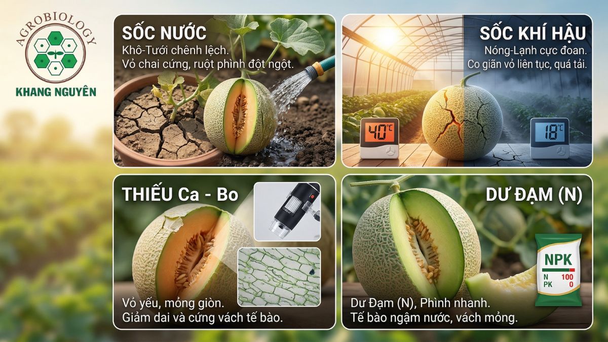 Giai đoạn vô đường, hàm lượng đường (Brix) trong quả tăng cao tạo áp suất thẩm thấu lớn. Nếu lỡ tưới dư nước hoặc trời mưa đột ngột, quả sẽ hút nước cực mạnh làm ruột phình nhanh xé toạc lớp vỏ cứng.