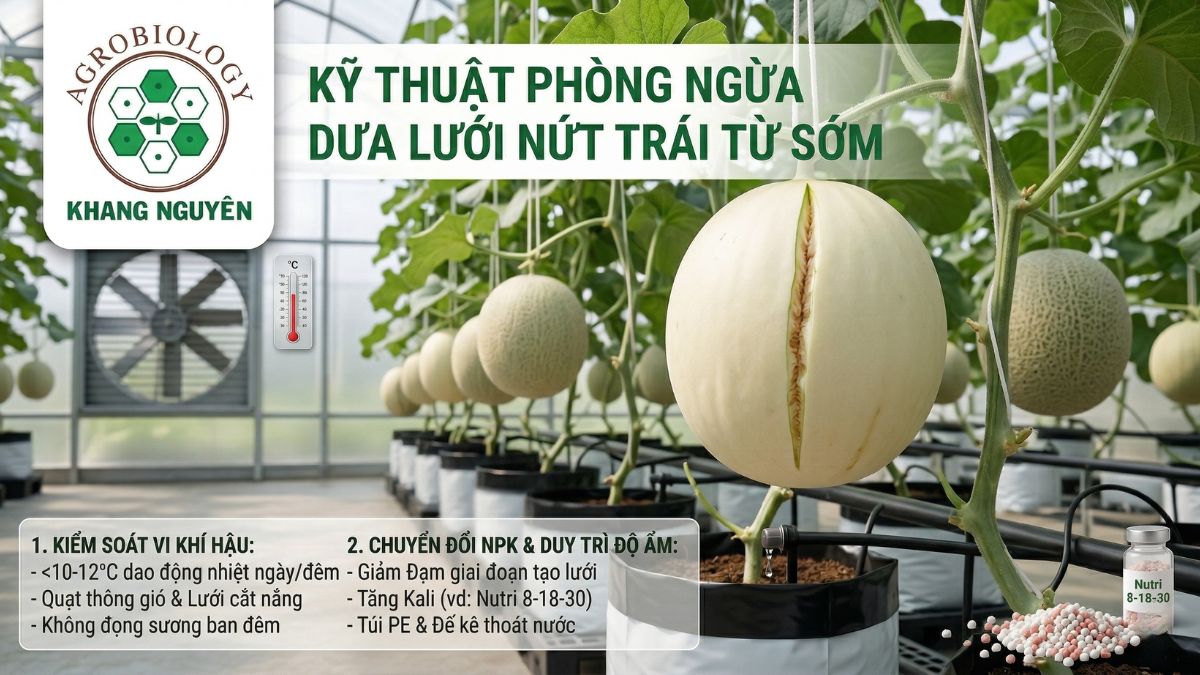Việc dưa lưới bị nứt trái là một thiệt hại nặng nề, trực tiếp làm sụt giảm sản lượng và giá trị thương phẩm. Tuy nhiên, chỉ cần Anh/Chị kiểm soát tốt lượng nước tưới hàng ngày, bổ sung Canxi – Bo đúng lúc và áp dụng phân bón giàu Kali giai đoạn vô đường, tình trạng này sẽ bị triệt tiêu hoàn toàn. Chúc Bà con quản lý vườn chặt chẽ, trái lên lưới tuyệt đẹp, đạt độ Brix chuẩn và thắng lớn trong vụ xuất khẩu tới!