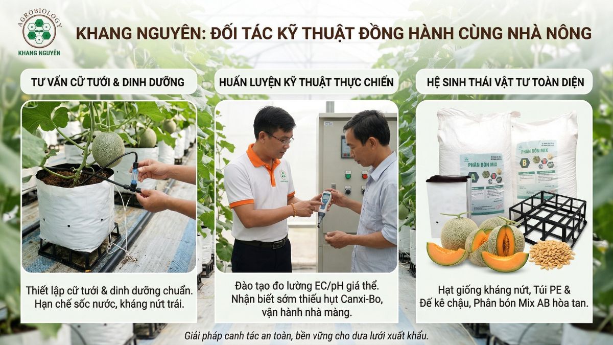 - Hệ sinh thái vật tư toàn diện: Khang Nguyên cung cấp trọn bộ hạ tầng khép kín từ Hạt giống dưa lưới (vỏ dai, kháng nứt), Túi PE & Đế kê chậu (ổn định độ ẩm rễ), cho đến các dòng Phân bón Mix AB hòa tan 100% giúp cây hấp thu dinh dưỡng cân đối. Tất cả tạo nên một quy trình chuẩn hóa, bảo vệ trái dưa lưới tròn trịa, lên lưới đẹp mắt và đạt độ ngọt xuất khẩu.