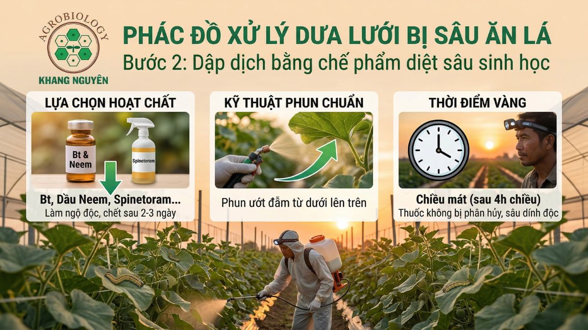 Khi dưa lưới đã đậu trái, tuyệt đối không lạm dụng các loại thuốc sâu hóa học độc tính cao vì sẽ để lại tồn dư, vi phạm tiêu chuẩn dư lượng xuất khẩu. Bà con hãy áp dụng phác đồ 3 bước chuẩn sinh học sau: