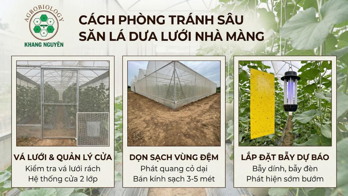 Để không phải đau đầu xử lý dưa lưới bị sâu ăn lá, Anh/Chị cần phải chặt đứt con đường xâm nhập của bướm đêm (thành trùng của sâu) bằng các hàng rào vật lý sau: